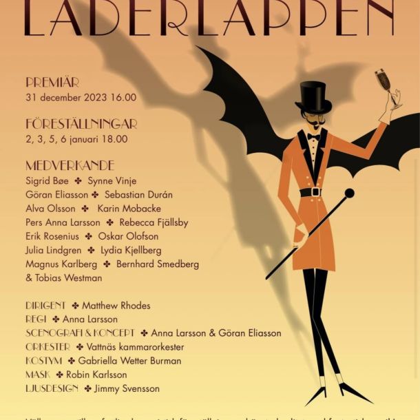 Läderlappen av Johann Strauss är en humoristisk, vacker, allvarlig och galen nyårsföreställning där vi får möta den rike vivören Eisenstein (Göran Eliasson), hans listiga hustru Rosalinda (Sigrid Bøe och Synne Vinje), deras ännu listigare kammarjungfru Adéle  (Alva Olsson och Karin Mobacke), hennes syster Ida görs av Lydia KjellbergKoch Julia Gunvor Lindgren.Alfred, sångare och sånglärare (Tobias Westman), Frank, fängelsedirektör (Erik Rosenius), Doktor Falke (Sebastian Durán), Prins Orlofsky, en excentrisk uttråkad rysk furste (Anna Larsson och Rebecca Fjällsby) och Frosch, förvirrad och försupen fångvaktare (Magnus Karlberg). I ensemblen i mindre roller ses och hörs tenoren Bernhard Smedberg och barytonerna  Oskar Olofson och Marcus Bartoletti .